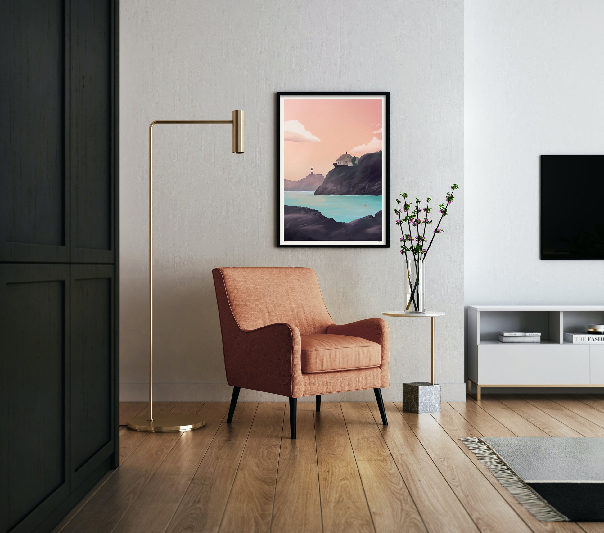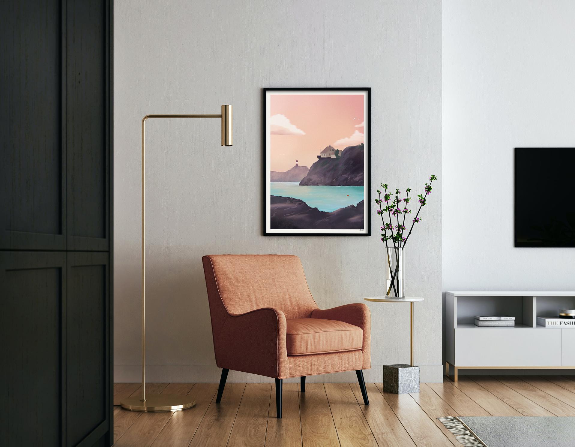 Digitalt kunsttrykk av Hatholmen fyrstasjon med Ryvingen Fyr i bakgrunnen. Kan fås med eller uten teksten "Mandal".